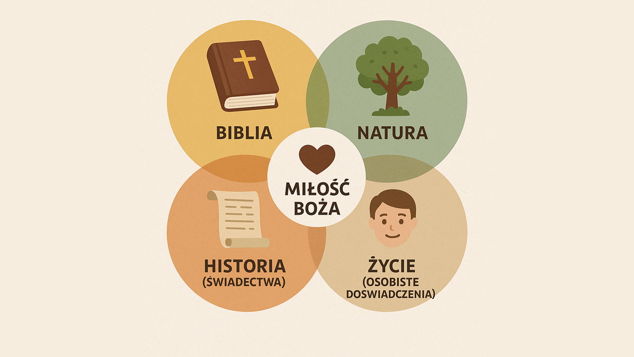 Boską miłość możemy dostrzec na cztery sposoby. Po pierwsze — w Biblii. Po drugie — w Księdze Natury, czyli w przyrodzie i jej prawach. Po trzecie — w Historii, tu bym dodał, że także tej najnowszej, opowiedzianej w świadectwach, którymi podzielimy się wieczorem. I po czwarte — w naszym własnym życiu i doświadczeniach. Żeby jednak naprawdę zobaczyć Boga, musimy zdjąć „okulary uprzedzeń” i tradycji, które czasem zniekształcają Jego obraz. Teraz skupimy się głównie na Biblii, a trochę też na przyrodzie i historii.
