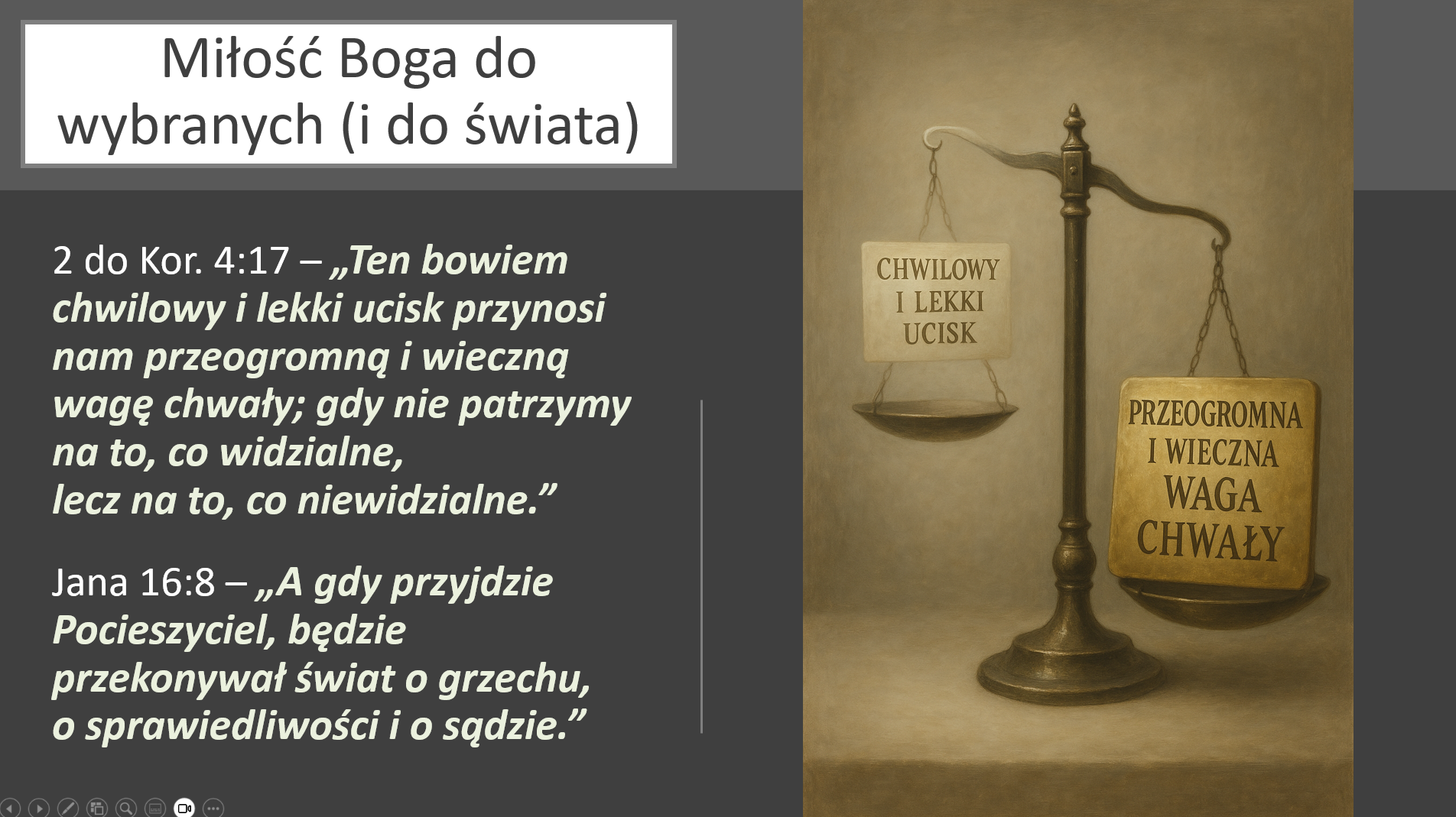Przyp. 21:21 – „Kto podąża za sprawiedliwością i miłosierdziem, znajduje życie, sprawiedliwość i chwałę.” i jeszcze komentarz do tych słów: „Kto rozwija Boski charakter, osiągnie życie, ducha prawdy i chwałę od Boga”. A tego Wam wszystkim życzę i pragnę też dla siebie. Dziękuję za uwagę!