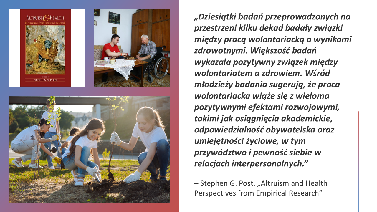 Takie nastawienie daje wymierne korzyści (choć nie dlatego należy to robić – jeśli chcemy być najbardziej podobni do Boga): Badania pokazują np., że młodzież angażująca się w wolontariat ma lepsze wyniki w szkole i większe umiejętności życiowe. A dorośli? procentowo mniej chorób, mniejszą demencję i większą samodzielność w późniejszych latach życia. Wiemy, że choroby fizyczne i psychiczne nie będą nas omijać i wiemy też, że wszyscy jesteśmy skażeni i obarczeni wyrokiem, ale chcę po prostu pokazać, z jak różnych punktów widzenia MIŁOŚĆ może być korzystna. Wolontariat nie wymaga fundacji – to miłość wobec braci, sióstr, rodziny czy sąsiadów. Zawsze jest wiele okazji do czynienia dobra, zwłaszcza tych mało widocznych i podejmowanych przez niewiele osób. Pora się rozejrzeć. Wynotowałem piękne zdanie z czasopisma „Teraźniejsza Prawda” nr 468, s. 2 – Czynienie czegoś dla kogoś bez myśli o nagrodzie jest naprawdę działaniem podobnym do Boskiego.