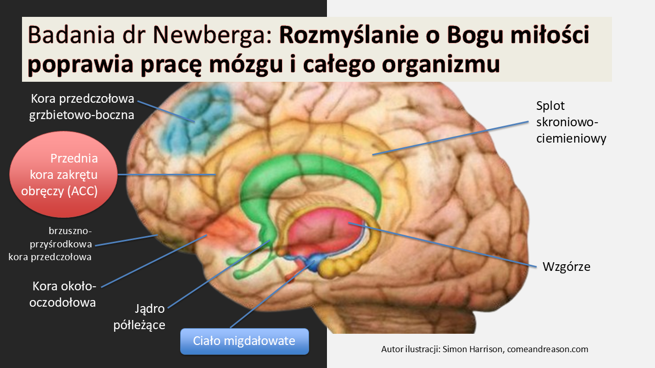 Badania wykazały też spadek ciśnienia i tętna, co świadczy o lepszej pracy ciała migdałowatego — naszego „alarmu” w mózgu. Ciało migdałowate jest potrzebne, mówi o zagrożeniu. Jednak gdy jest ono ZBYT aktywne, żyjemy w napięciu i stresie. Wiara w Boga miłości przez wpływ na inne części mózgu pomaga ten alarm wyłączać i przynosi wewnętrzny spokój.