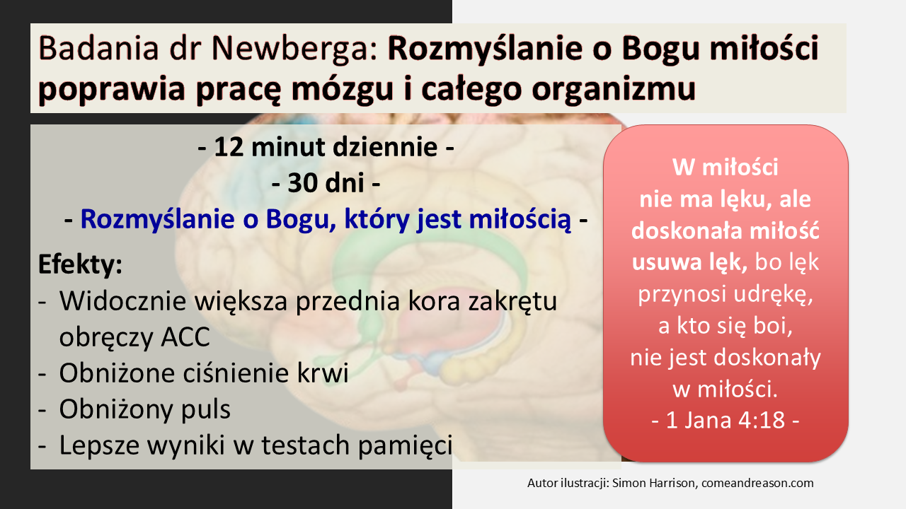 Co ciekawe, wiara w Boga, który jest Bogiem miłości, wpływa nie tylko na nasz charakter, ale także na funkcjonowanie mózgu i całego organizmu. Badania dr Andrew Newberga z Uniwersytetu Pensylwanii pokazały, że osoby starsze, które przez 12 minut dziennie przez 30 dni rozmyślały o Bogu miłości, doświadczyły pozytywnych zmian w mózgu. Zwiększyła się aktywność w tzw. przedniej korze zakrętu obręczy — części mózgu odpowiedzialnej za uwagę, podejmowanie decyzji, emocje, współczucie i kontrolę impulsów. Kiedy ta część mózgu działa słabiej, łatwiej o depresję czy stany lękowe. Ale podobnie jak mięsień — można ją „ćwiczyć”, np. przez sposób myślenia i przeżywania naszej wiary.
